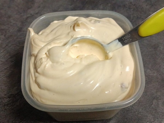 Обжарьте ломтики бекона на сковороде 6-7 минут с каждой стороны до полного вытапливания жира и хрустящей корочки. Выложите на бумажные полотенца. Весь жир слейте в мерный стакан, остудите. Затем добавьте оливковое масло и растительное масло, что получить 125-150 гр. 6 ломтиков оставить на сэндвич, остальные нарезать. В блендер сложите желтки, яблочный уксус, горчицу, лимонный сок, и хорошо взбейте. Следом медленно влейте смесь масел и взбивайте до однородной майонезной консистенции. Переложите в миску, добавьте сметану, соль и черный перец, перемешайте и добавьте нарезанный бекон. Уберите в холодильник.