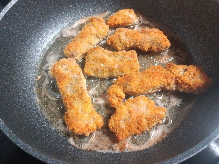Насыпьте муку в одну миску, измельченные крекеры в другую, в отдельную разбейте яйца. Обваливайте свинину в муке, затем в яйцах и затем в сухарях панко или измельченных крекерах.