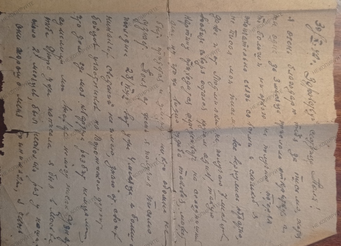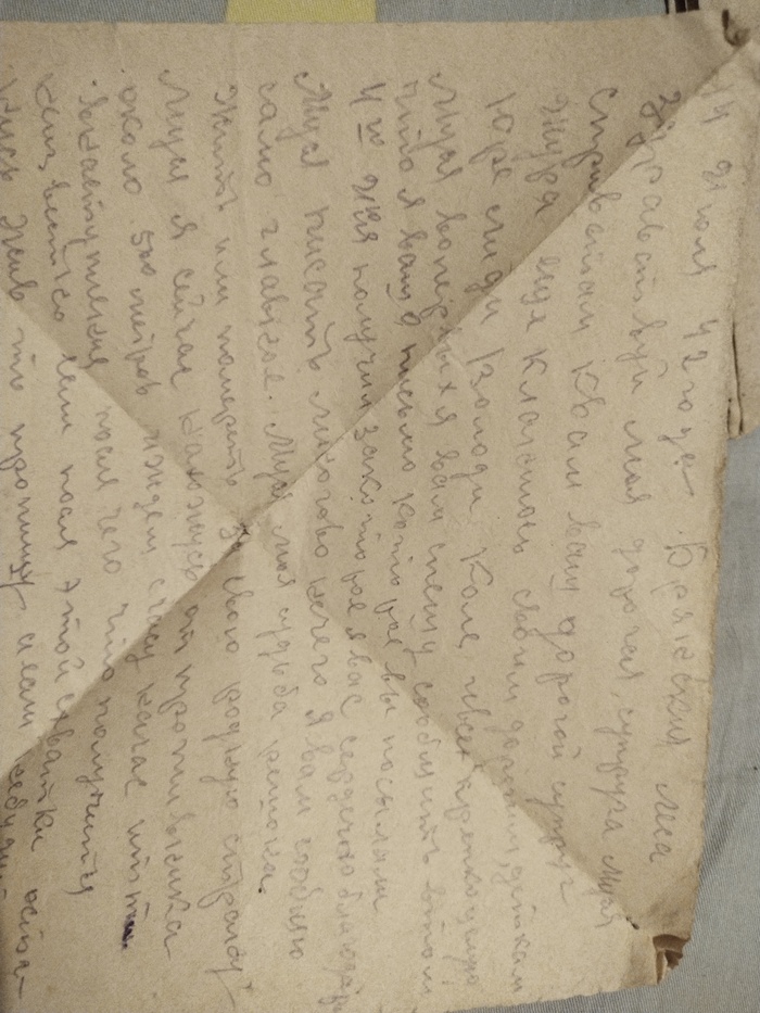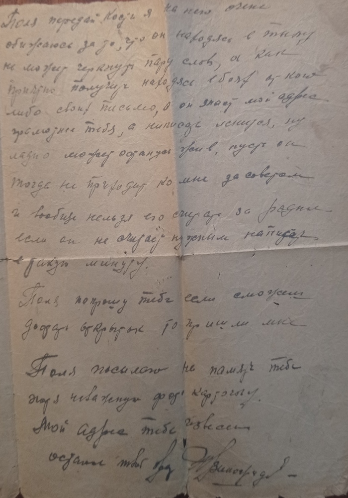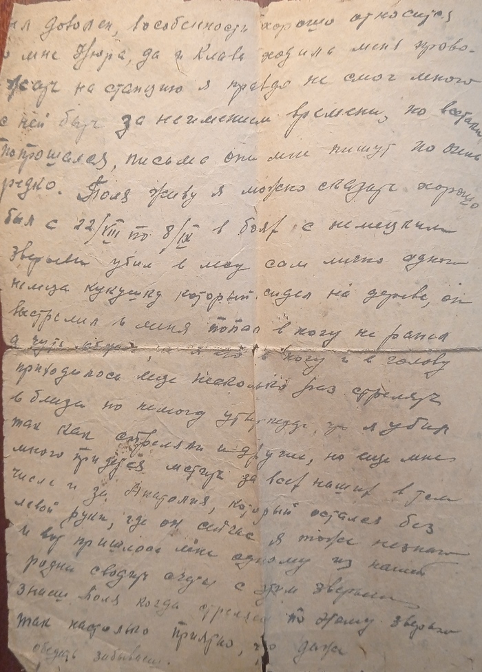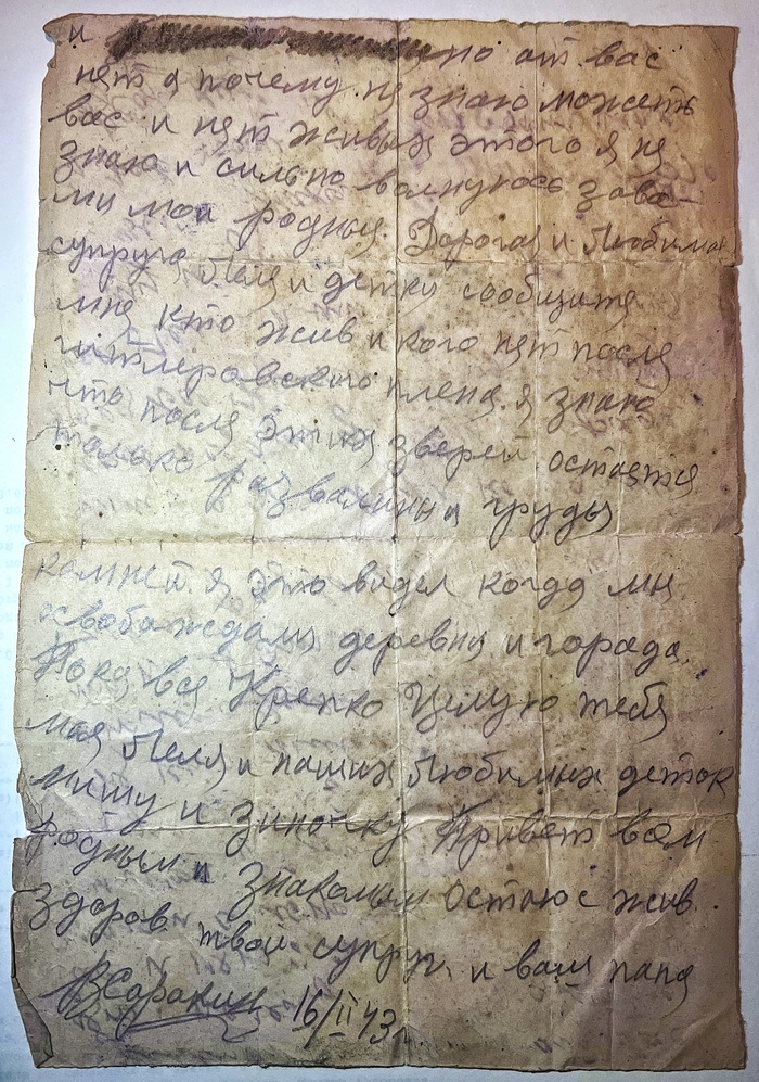 Дорогая моя Леля, я сильно волнуюсь за вами от того, что не могу знать о вас мои родные живые вы или нет. Я вам послал четыре письма ... не могу получить ответа поэтому сильно волнуюсь за вами. Я посылал вам письма с дороги из ... из ... и ... но от вас нет почему не знаю, может вас и нет в живых этого я не знаю и сильно волнуюсь за вами мои родные. Дорогая и любимая супруга Леля и дети сообщите мне кто жив и кого нет после гитлеровского плена. Я знаю, что после этих зверей остаются только развалины и груды камней, я это видел, когда мы освобождали деревни и города.