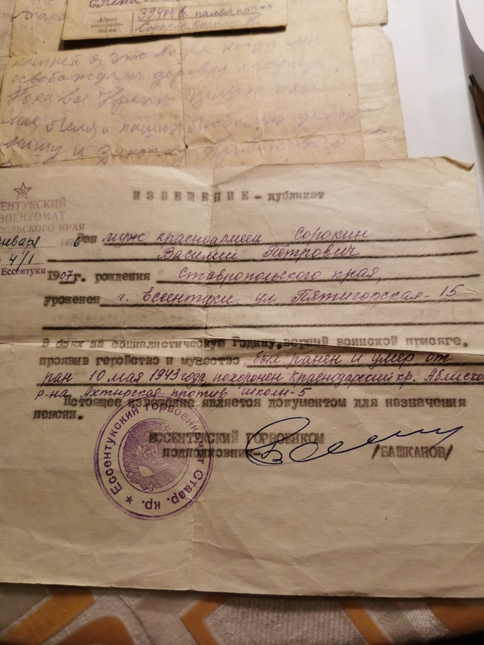 Мой прадед Василий Сорокин на момент начала войны был призван в Ессентуках и направлен в одну из частей, которая отступила из Ставропольского края. Он знал, что семья оказалась в оккупации.