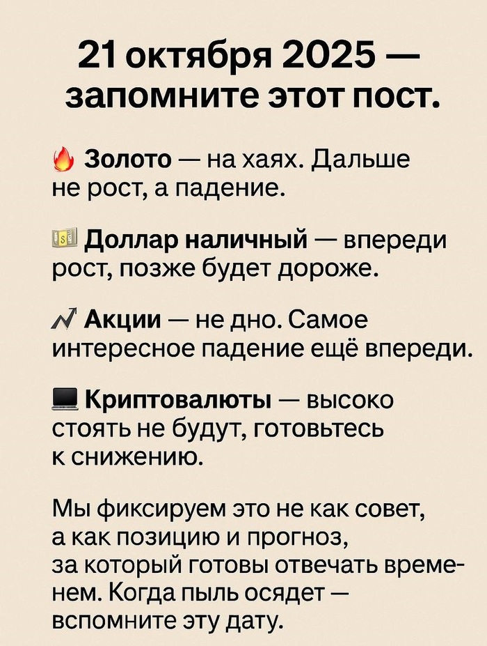 21 октября 2025 года, Коля из Эры перемен опубликовал пост с картинкой в которой изложил свое видение дальнейшего движения активов. Все это сопровождалось формулировкой: «Когда пыль осядет вспомните эту дату».