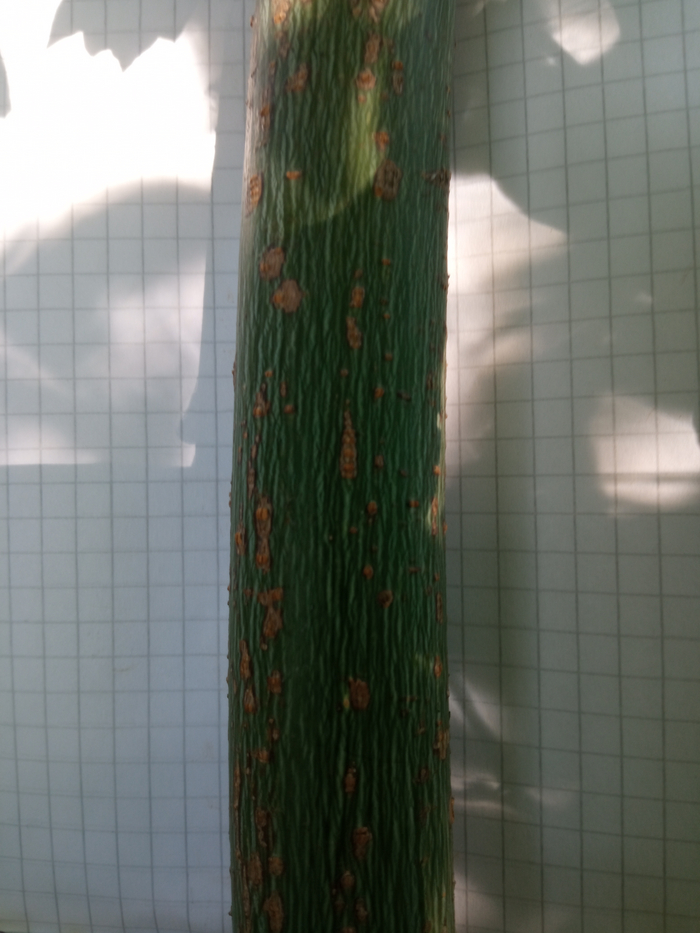 Деревья, ствол которых на фото, высокие, не менее двух с половиной метров. Я искала и ни разу не видела фото в интернете или в природе юга России растений такой высоты, у которых был бы ствол такого яркого зеленого цвета. Дерево на первом фото я растила тем способом, который описала. То, ствол которого на втором, было ранее гораздо выше( я его переделывала) и у него была кора, очень жесткая, коричневого цвета. Оно практически просело за 15 лет и появился зелёный цвет. Этому процессу есть свидетели. Я считаю, что деревья получают много воды из под земли. Полива нет в течение многих лет. По размеру клеток тетради можно судить о том, что это взрослые растения.