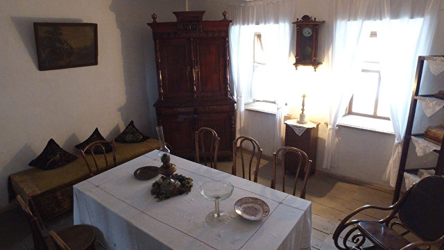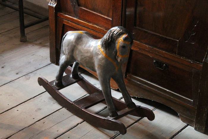 Внутри все довольно простенько. Но для начала ХХ века вполне приличное убранство. Практически все вещи подлинные. И стол, за которым обедала вся семья, и настольные часы, и гитара матери, и даже ее пудреница, и колыбельки детей, и любимая игрушка будущего полководца — конь-качалка: