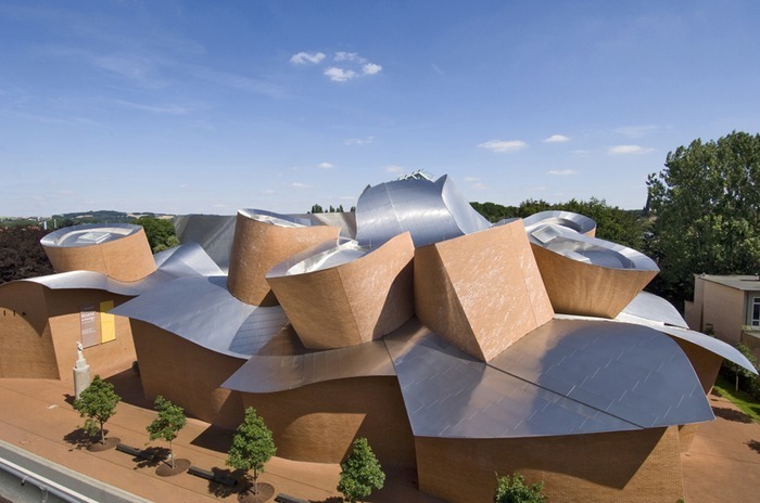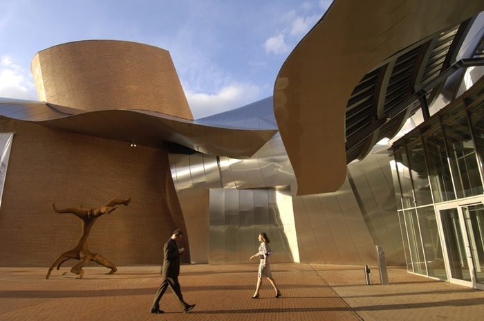 Фрэнк Гери - один из основателей BIM (метод создания Информационной Модели Здания), никогда не работает с компьютерными средствами и проектирует только вручную. Он собирает вокруг себя профессионалов, чтобы воплотить свои невероятные замыслы. Концертный зал Уолта Диснея – результат труда 60 графиков, инженеров, моделлеров. Сложные, текучие формы, излюбленная нержавеющая сталь в качестве отделки фасадов.