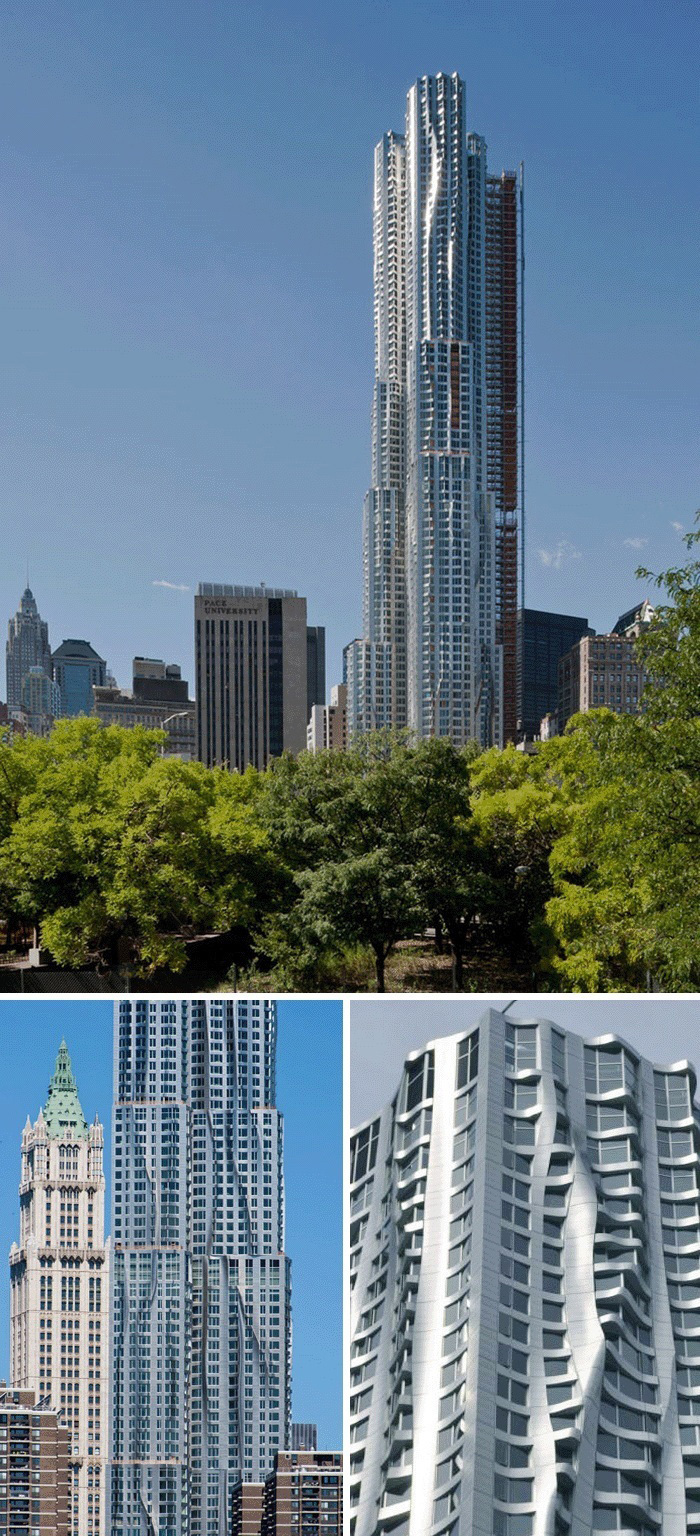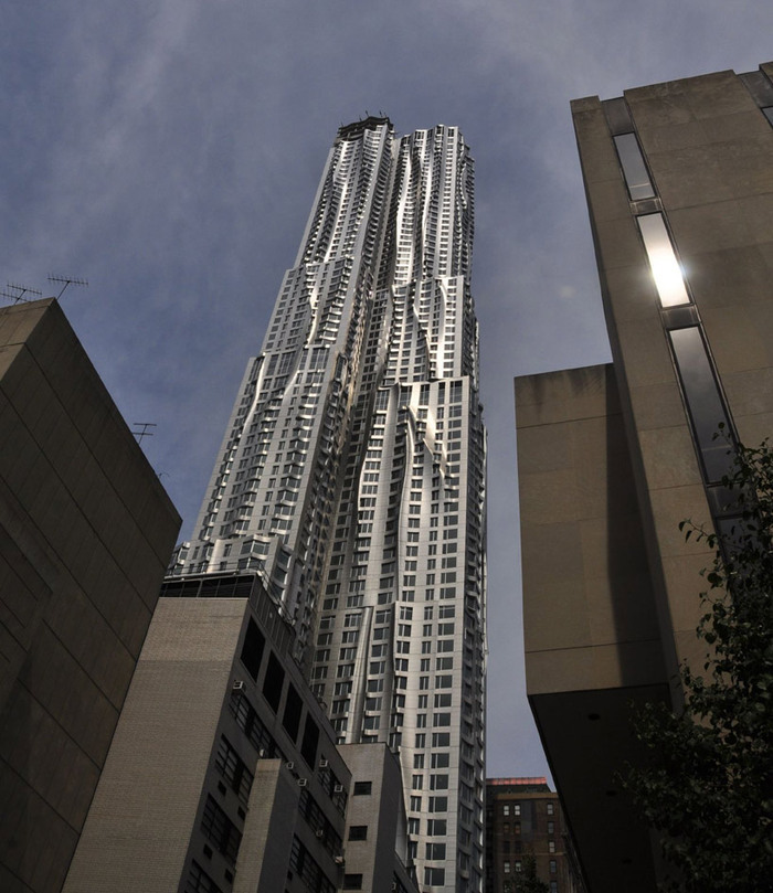 Жилая башня в 76 этажей достигает высоты более 265 м. Несущий каркас – железобетонный, фасады – традиционная для Фрэнка Гери нержавеющая сталь. Здесь запроектированы: школа, открытый бассейн, художественные студии, библиотека. Создаётся ощущение, что на верхних этажах Бикмана могли бы поселиться все голливудские злодеи.