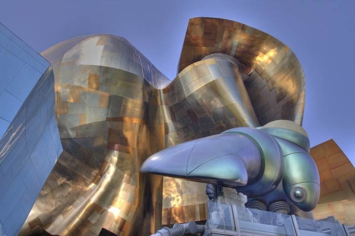 Инициатором проекта Музея американской поп и рок-музыки был Пол Аллен – основатель Microsoft Corporation и поклонник творчества Дж. Хендрикса. Интерактивный музейно-выставочный центр облицован нержавеющей сталью и крашеным алюминием. В составе помещений – «Небесная церковь», идеальная музыкальная площадка, воплощённая мечта Хендрикса – пространство 30-метровой высоты с прекрасной акустикой и фризом из видеопроекций. Фрэнк Гери предусмотрел также звуковую лабораторию – здесь любой посетитель может создать свою музыку, как он её понимает и чувствует.