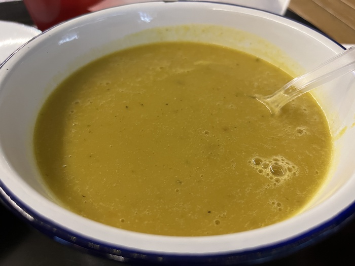 Ложка, к сожалению, пластиковая одноразовая. Сам же супчик хорош. Не очень густой, но в меру пряный. Те, кто как и я, обожают чечевичный суп, оценят его просто за факт наличия.