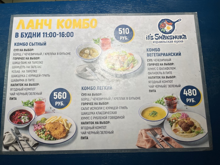 По вывеске можно догадаться, что флагманское блюдо заведения – израильская шакшука. Но я пришёл сюда за другим. В кафе три варианта комплексных обедов от 480 до 560 рублей.