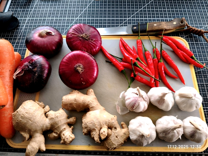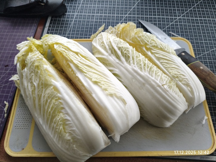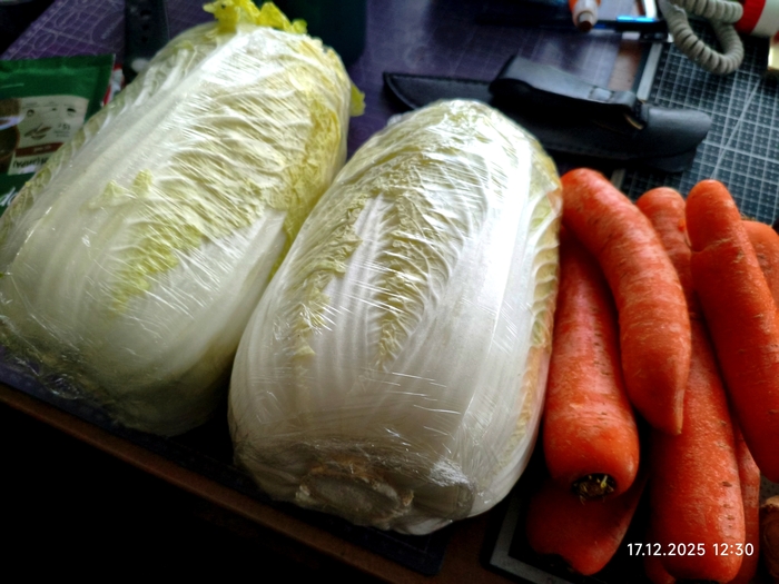 У нас было.. две капусты пекинской Четыре луковицы красной две штуки имбиря сем морковок пятнадцать стручков перца шесть головок чеснока одна пачка паприки копчёной одна пачка кумина