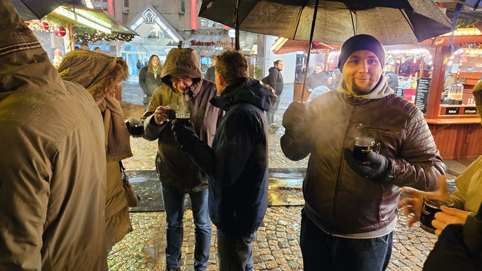 На каждого сотрудника компания выделяет 25 евро и отцы-командиры должны придумать, как с умом эти деньги потратить. Пару лет подряд нам предлагали доплатить самим ещё по 20 евро и посетить тематический ресторан немецкой кухни в городе, в котором я живу. Перед посещением ресторана всегда была традиционная прогулка по рождественскому рынку (всегда под проливным дождём, что добавляло пикантности и новогоднего настроения) с выпиванием глинтвейна и осмотром лотков с расписными поплавками и прочей ерундой. В ресторане нас ожидал шведский стол в опять-таки классическом немецком стиле и безлимитный пивас, сваренный на местной пивоварне. Возможно из-за того, что эти посиделки проходили с коллегами из другого отдела или из-за ибытка пенного, но здесь было прям душевно, несмотря на то, что я в то время очень плохо знал немецкий (да и сейчас мало что изменилось), я не чувствовал себя лишним на этом празднике жизни, все весело общались, обнимались, говорились тосты, в общем, сие мероприятие мало чем отличалось от семейных посиделок. Так мы провели 2 рождественских корпоратива. После второго мы даже узким кругом пошли в ирландский паб и за счёт фирмы неплохо ещё употребили "Гиннеса" и выкурили по трубке (да, в Германии в некоторых пабах всё ещё можно курить внутри). Тогда мы ещё не знали, что в компании настают "тяжёлые времена".