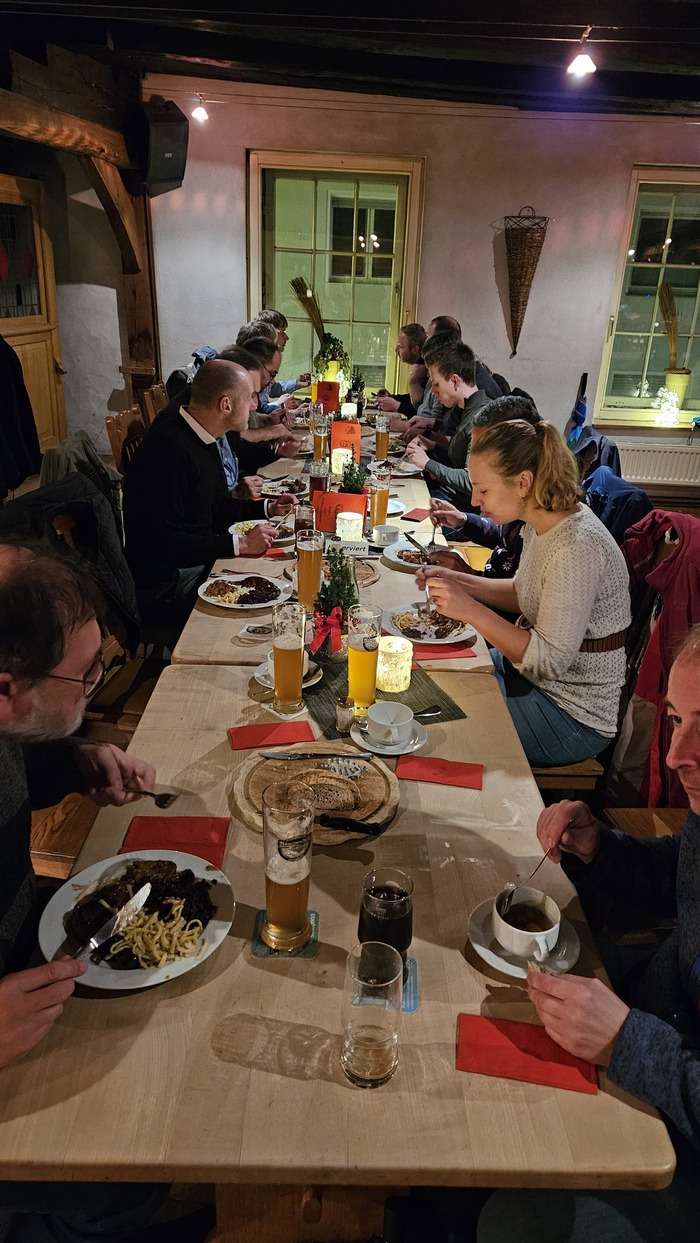 Мероприятие всегда проходило в одном и том же ресторане недалеко от завода. В назначенный час (а именно в 17:00 в четверг) мы прибывали на место, где нас уже ждали налитые бокалы с пивом (что мне, как человеку, живущему за 40 км от работы и вечно пребывающему за рулём, крайне терзало душу) и классический П-образный банкетный стол. Первые часа 1,5 все просто стояли небольшими группками и вели неспешные беседы, впитывая бокал за бокалом. За эти 1,5 часа в соседнем зале нам сооружали шведский стол, на который, конечно же, все набрасывались, как стая диких кабанов, ибо есть хотелось безумно. В целом-то еда была хорошей, классическое немецкое тушёное мясо разных видов, всевозможный жареный-печёный-варёный-пареный картофель и капусточка (которая, как известно, дело хорошее). Так что голодным точно никто не оставался. А дальше до конца вечера все просто перемещались между компаниями по интересами и упивались пивом в течение пары-тройки часов. Не могу сказать, что мне такой формат не понравился, но душевности в нём явно не хватало. Как я понял, это мероприятие повторяется из года в год без каких-либо изменений.