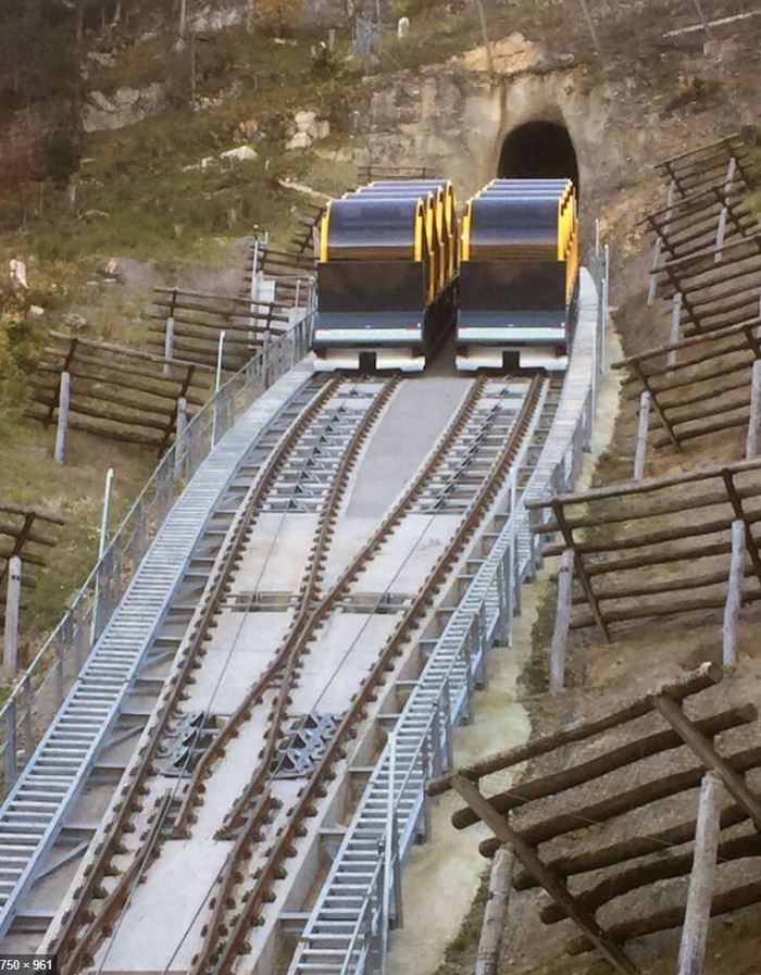 Таким образом нарушается равновесие, верхний вагон перевешивает и фуникулёр приводится в движение.
