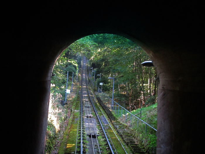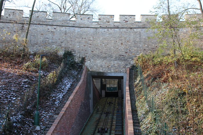 В одном месте фуникулер проходит прямо под древней крепостной стеной.