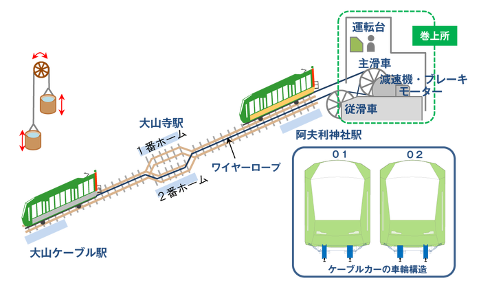 Вагоны связаны между собой тросом, таким образом их движение чётко синхронизировано. Трос протянут от одного вагона к другому через верхнюю станцию, где находится привод системы (электродвигатель).