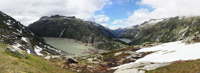 Озеро Гельмер искусственное, которое образуется за счет таяния снега в горах и используется гидроэлектростанцией Гримзель.