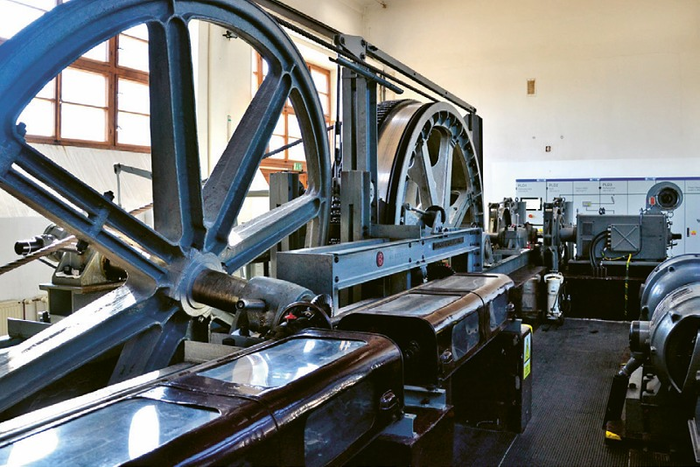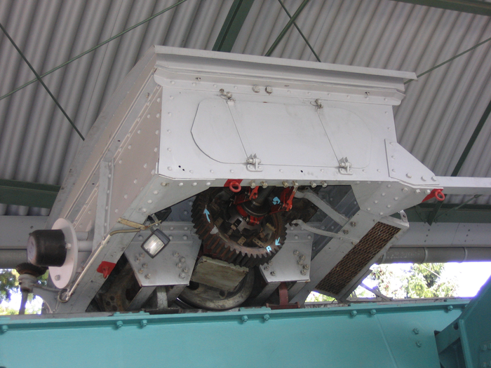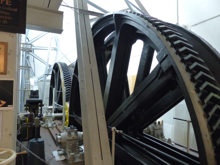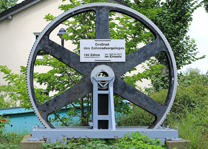 Приводной шкив с ведущей шестерней горной железной дороги 1913–1967 годов, установленный сегодня на станции в долине.