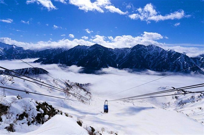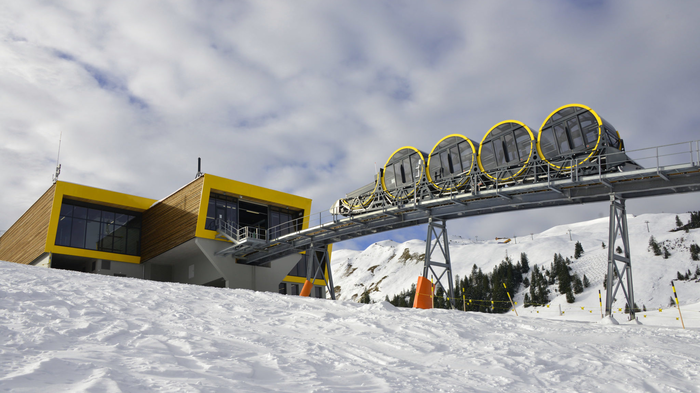 Открытый вагон подъёмника за 10 минут доставляет 24 человека к озеру Гельмер, расположенному на высоте 1 860 м над уровнем моря.