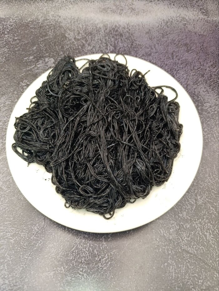 Мне понадобилась чайная ложка чернил каракатицы, чуть больше минуты и вуа-ля! Сильный рыбный запах растворяется и соль тоже уходит, то есть съесть блюдо без добавок не выйдет, потому что оно будет слишком пресным. Я добавила специальную заправку для фунчозы в уже холодное блюдо. На переднем вкусовом плане была заправка, но стойкий рыбный оттенок на вторых позициях всё же присутствовал, а язык слегка окрасился.