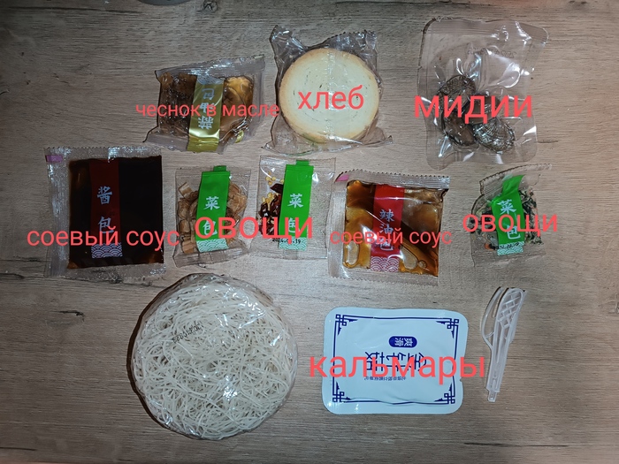 Внутри нас встречает 9 пакетиков с соусами и приправами, плюс фунчоза и вилка