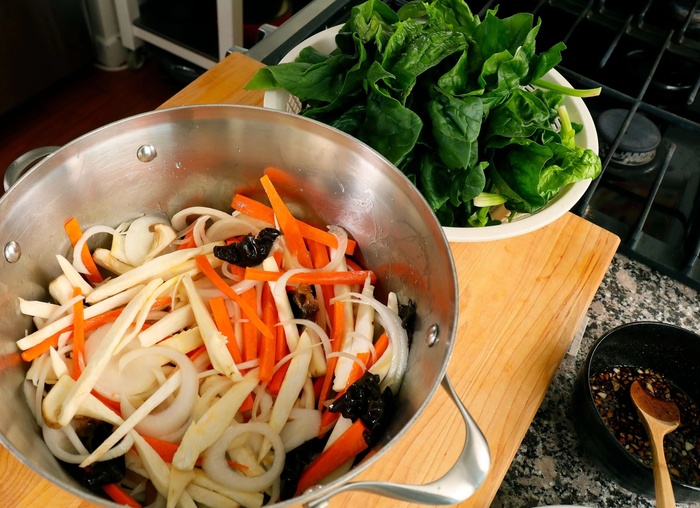 Ну а способ приготовления слегка необычен для России, но классический для Азии. Овощи и лапшу залить кипятком, аккуратно слить воду и добавить соус (соевый и терияки). Раз чайник готов-пора запаривать! Но! Взглянем на её внутренний мир!