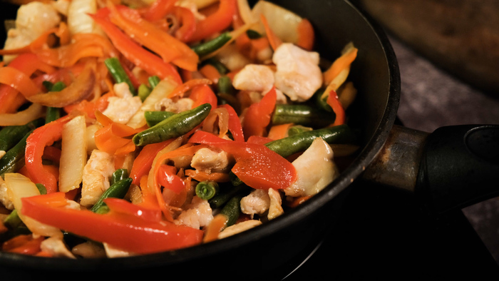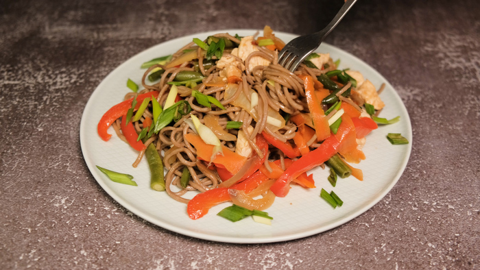 Фунчоза стала прозрачной. Несмотря на то, что я не большой любитель фунчозы, мне она понравилась. Снаружи мягкая, внутри упругая. Скользкая. С непривычки соскальзывает с палочек. Пришлось потренировать ловкость.