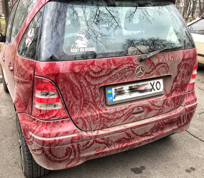 К сожалению, грязи оказалось слишком мало для контрастного рисунка, да и красный не лучший фон.