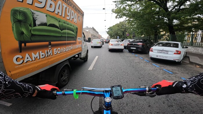 Придерживаю ему байк, пока он крепит обратно велорюкзак. Рама у дядьки огромная, высокая. Багажник высоко. И со стороны становится страшновато от вида этой трясущейся и вихляющей конструкции, над которой возвышается битком набитый заплечник.