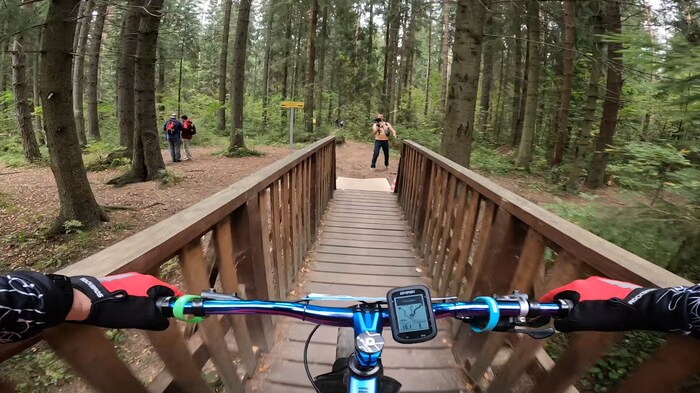 На старте камеру я включить, естественно, забыл и включил только спустя минут 10-15, а сдохла она где-то в середине второго круга. Перед мостиком собралась пробка, там зачем-то все спешивались, пришлось и мне: