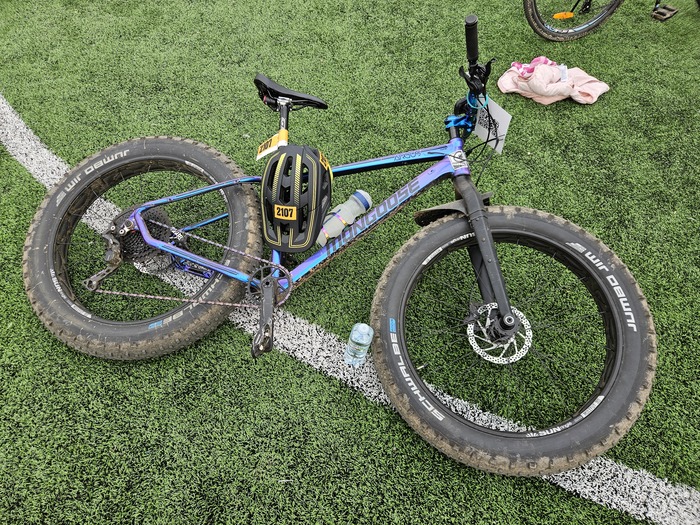 На месте получил наклейку категории на номер и стал ждать старта. На 40 км было две категории: А - гревелы и B - прочий МТБ. Среди всех участников нашелся только еще один псих на жиробайке.