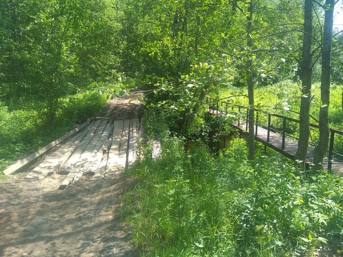 Ручьи и болотины пересекают капитальные пешеходные мостики. Замечаю пару велосипедистов, отдыхающих на берегу.озера. Уже ближе к оз.Фигурному попадаются навстречу парень с девушкой, по виду кантрийцы решившие провести вечернюю тренировку. Хорошо знакомые дорожки быстро выводят к разбитой автомобильной дороге, по которой уже финиширую в Орехово.