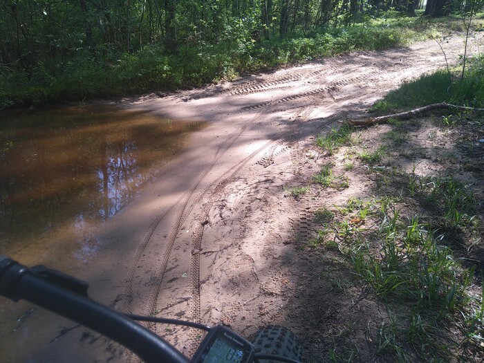 И вперёд-вперед. По мимо корабельных сосен. Дорога все такая-же. Хороший грунт периодически сменяется рыхлым песком. Длинный, песчаный спуск к ручью. В прошлом году мы едва ползли по нему, колеса страшно вязли. Но толстяки отлично держат и мигом пролетаю до переправы и мостика.