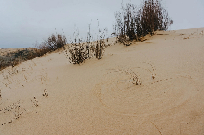 Чем дальше я заезжал, тем сильнее менялось покрытие под колесами: сначала это был ковер из лишайников, мха и мелких кочек сухой травы, затем в нём начали появляться крупные песчаные проплешины, а в итоге всё сменилось высокими барханами с редкими сухими кустиками.