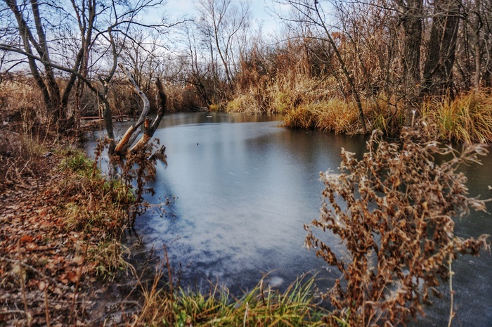 Маршрут ненадолго сворачивал к берегу Дона, после чего уже уходил вглубь песков. Прохладно, вода начала покрываться тонкой корочкой льда.