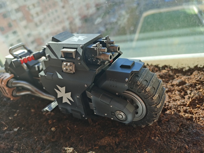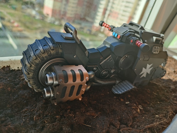 .....я бы хотел, чтобы такой зверь был в моей реальной жизни, но это всего лишь модель мотоцикла Храмовника из Warhammer 40 000, сфотографированный в горшке с выращиваемой на балконе редиской:)