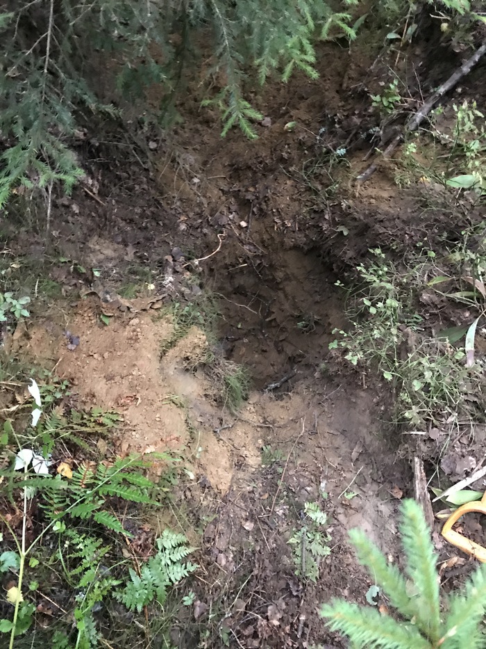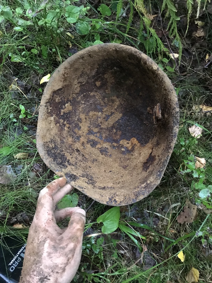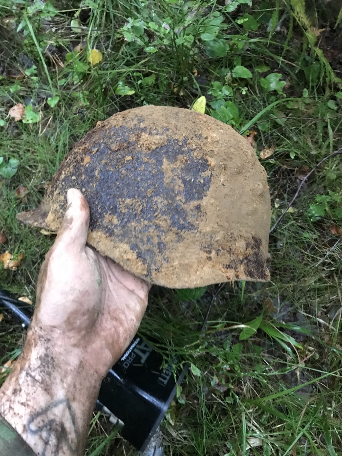 Так вот, приехав на совершенно незнакомое мне место, «то есть просто ткнул пальцем в навигаторе где есть лесок». Пошёл грибы искать, так сказать. Машу клюшкой, копаю всякую Жбонъ, все грибы порезали грибники ещё утром, и тут сигнал! Сигнал был четкий и доносился прямо с глубины траншеи. Прибор у меня garret AT PRO, и уже третий год мне служит верой и правдой, но тут казус, сигнал звуковой есть, а на шкале нет ничего. Ещё раз осмотрел траншею, с одного угла она подвыбита «уже кто то копал». А по тому месту где был сигнал, проходит обсыпавшаяся тропинка. Принял решение копать. Сняв слой земли СМ30 глубиной я наткнулся на кромку предмета, вросшего в землю. Как сразу я понял это каска, и как оказалось, не частый СШ39 «трехклепка»