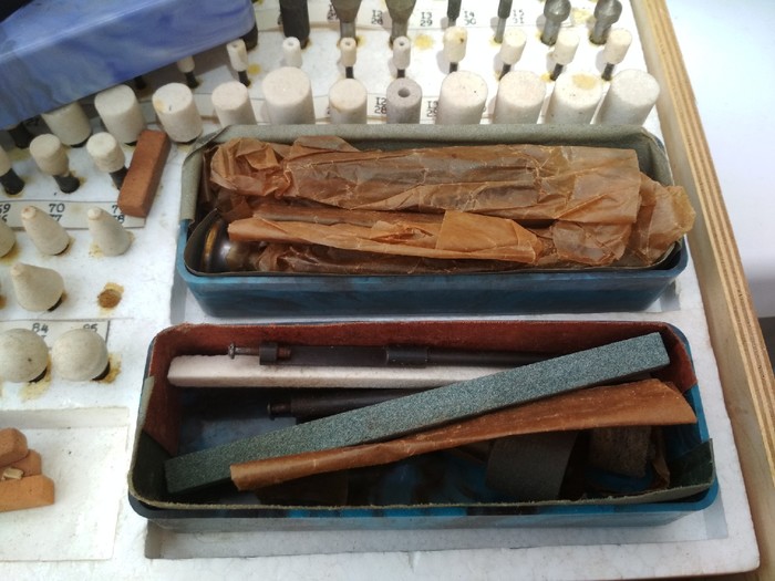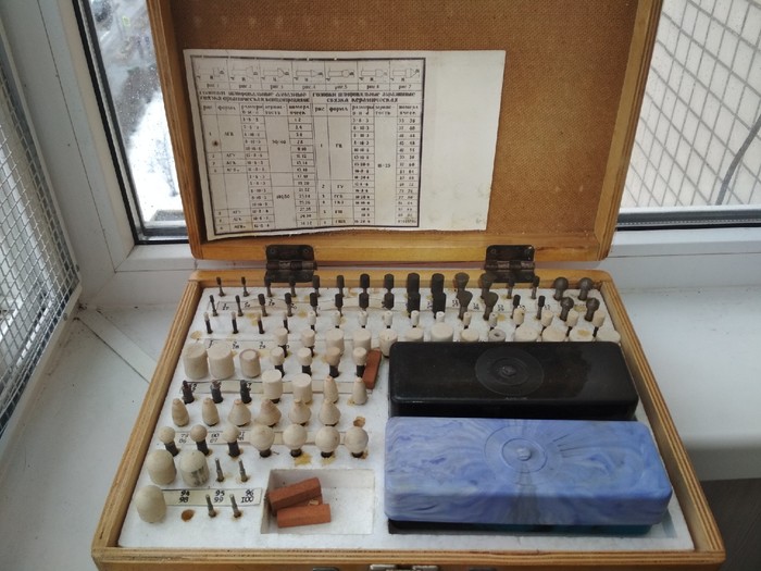 Чемодан с насадками на дремель) или чем тогда работали. Отец у меня занимался порошковой металлургией, видимо это набор для обработки металла.