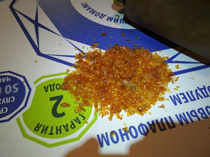 Пол банки янтарного цвета кристаллов , похоже на канифоль. Но обычно я ее находил большими кусками.