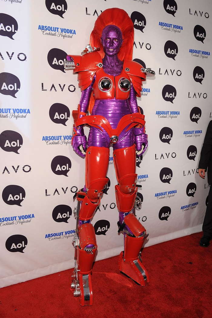 2010 год- Супергерой.На этот раз основными стали два цвета: красный и фиолетовый. Яркий костюм, который, к слову, напоминает броню Бэймакса из «Города героев», дополнил сверкающий боди-арт, острозаточенные зубы, красные глаза и мощная обувь, которая сделала и без того высокую модель гигантом — на протяжении всего вечера Клум смотрела на гостей с высоты 2,5 метра. Бывший супруг певец Сил решил не отставать и нарядился в костюм, напоминающий Серебряного сёрфера, — героя комиксов Marvel.