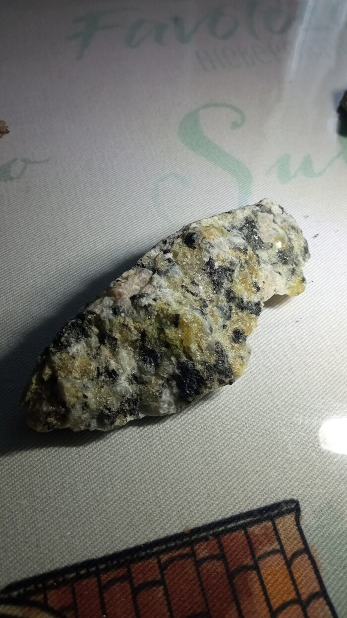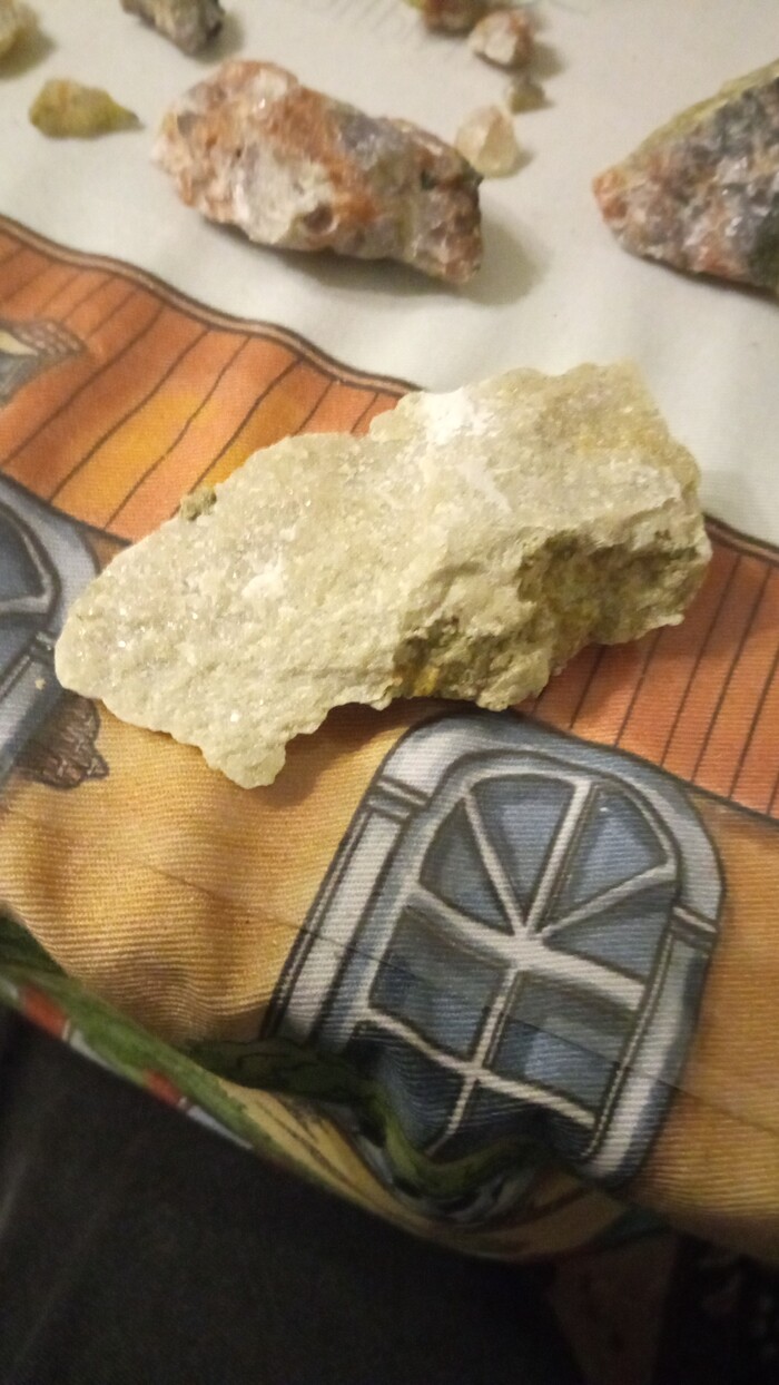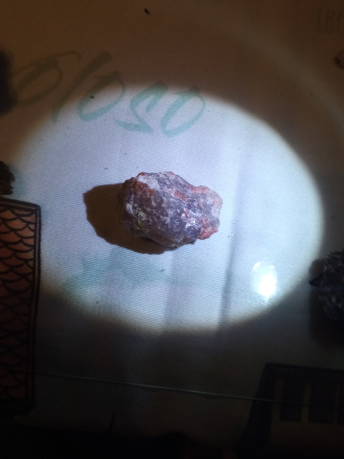Т.к. некоторые белые кварцы в составе конкреций оттуда имеют зелёную люминесценцию в УФ, был проведён рутинный контроль ультрафиолетовым фонарём. Свечение на некоторых образцах есть, но слабое. Но один фрагмент имел очень яркую люминесценцию - отправится в в коллекцию люминесцентных образцов.