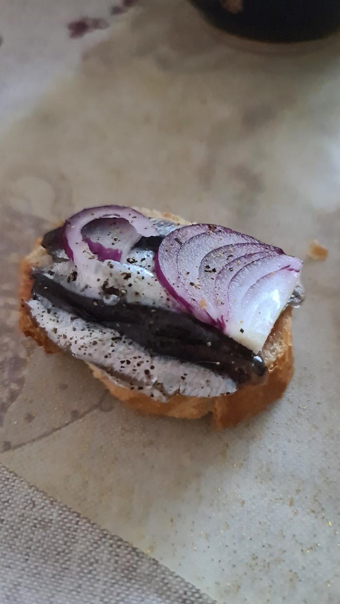 Филе хамсы с черным перцем, копченой паприкой и зеленью в масле. Минут 30 дать постоять.