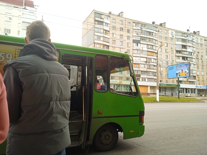 В мае было и жарко, и холодно. На этом майском фото с автобусом видно, что люди утеплились. Также здесь заметна цена на коммерческий маршрут – 25 гривен, другие не видела, не знаю. Людей там мало ездит, не все сидячие места заняты. В основном все передвигаются при помощи городского муниципального транспорта, бесплатном для всех, видела в телеграм одного из местных пабликов, что до конца 2025 года так и будет.