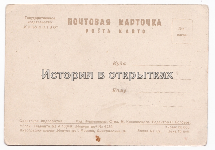 Авторами открытки являются Кукрыниксы (художники Михаил Куприянов, Порфирий Крылов и Николай Соколов). На открытке присутствует цитата из речи К. Е. Ворошилова на XVIII съезде ВКП(б) посвященной данным событиям, а также стихотворение Михаила Коссовского