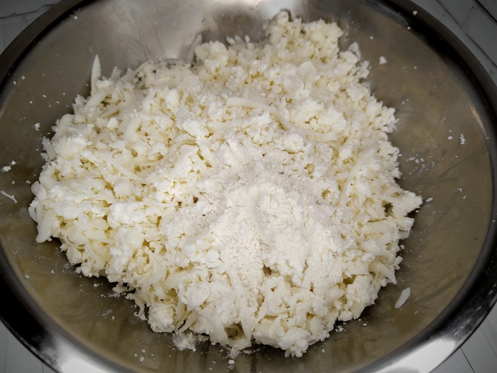 6. За полчаса до окончания срока заточения теста ломаем руками имеретинский/адыгейский сыр в относительно мелкую крошку (хотя бы, как творог), натираем на крупной тёрке сулугуни.