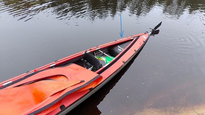Сложенная печка лежит в корме лодки, и в нее саму сложено все нужное - лопата, древесные пеллеты, пирометр и тд. Ее геометрия удивительно хорошо укладывается в обводы корпуса Ладоги-2 , и как итог она занимает очень мало места - в киле убраны бюрдюки с водой на 20 литров и упаковочный чехол лодки, и над самой печкой еще есть место для чего то плоского вроде тента.