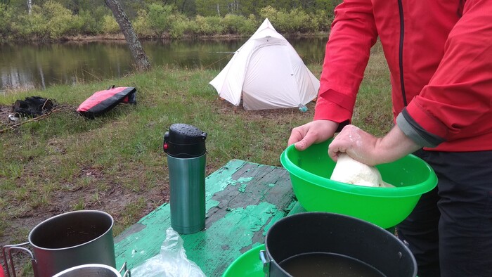 После замеса убираю миску с тестом в спальник , чтобы оно не остывало и дрожжи активировались - и иду заниматься уже обычным походным бытом, таким как готовка ужина на всю компанию