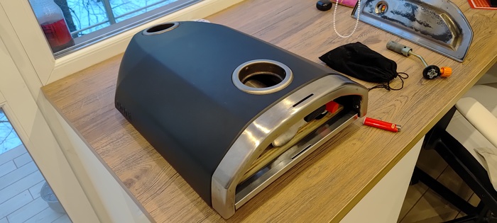 Но этот замечательный девайс позволил обойти эти ограничения) Вооружимся пирометром, пеллетами, углем, и посмотрим на чудо-предмет поближе. Конструкция простая - двойной корпус из нержавейки , на дне в выемке лежит каменная пластина, передняя часть закрывается заслонкой, в задней расположен лоток, в лотке - золотник, на который насыпается топливо (пеллеты, уголь, по идее все что горит но не пробовал пока). Над золотником расположен бункер (небольшая труба в задней части), из него топливо сыпется вниз по мере прогорания, поддерживая горение автоматически, а зола ссыпается в лоток. За счет горения появляется тяга, которая протягивает пламя от золотника до трубы (причем огонь там нешуточный, иногда языки вырываются даже из верха трубы, весь верх обдувается огнем). Собственно, это пламя и нагревает еду сверху. А плита снизу, нагреваясь от огня - греет блюдо снизу, все очень просто и без какой то сложной механики.