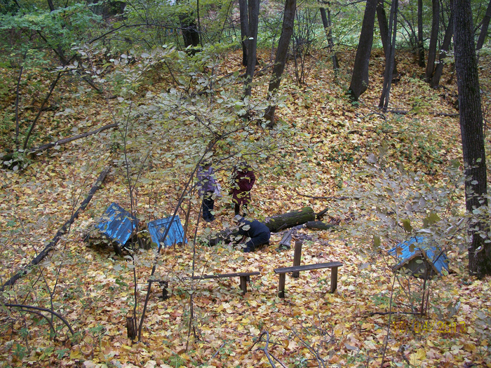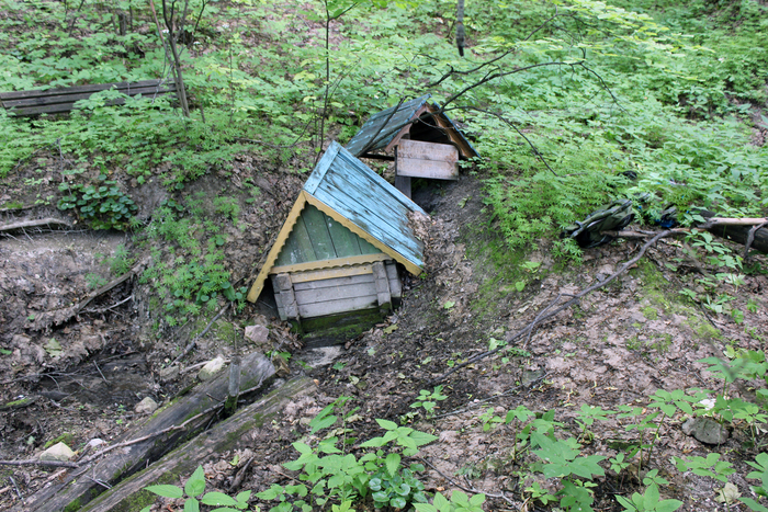 Оказалось, что в метрах 200-300 от смотровой вышки есть два родника. Находятся в овражке. Судя по тому, что пробирались через лесок и по бурьяну, посещают это место не многие. Заросшая бурьяном беседка родом из 70-х годов прошлого века была ориентиром.