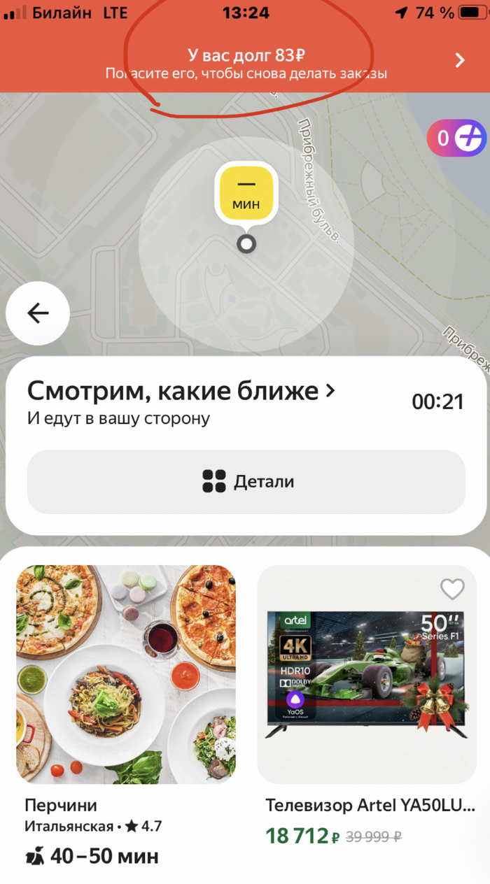 Что ж, такси нет, смотрю на телефон-13.24, появляется долг 83р.