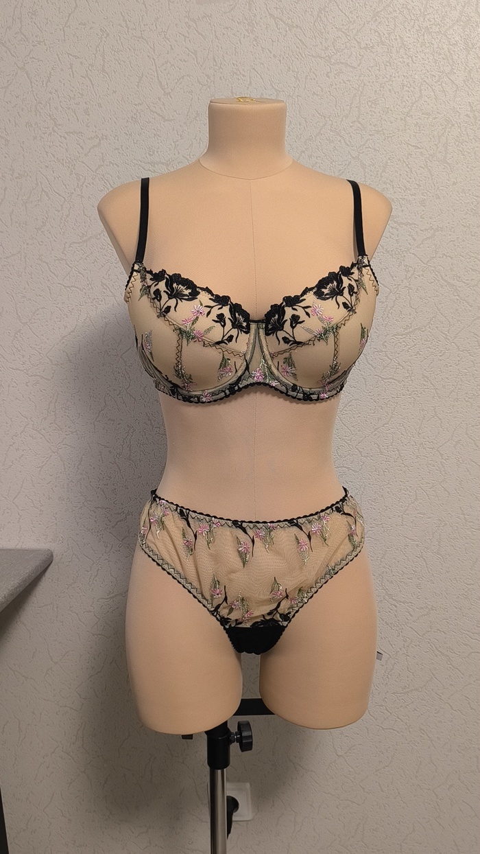 В результате получился вот такой комплект. бюстгальтер на косточках с поролоновыми чашками без пушапа. Чашки шила сама из поролона, это не готовый вариант из магазина. Не люблю готовые формованные чашки. В бразилках спереди изнутри добавила телесную сеточку для уменьшения прозрачности. Сзади черная сетка в два слоя. Самый удобный вариант бразилок по мнению моих клиенток.