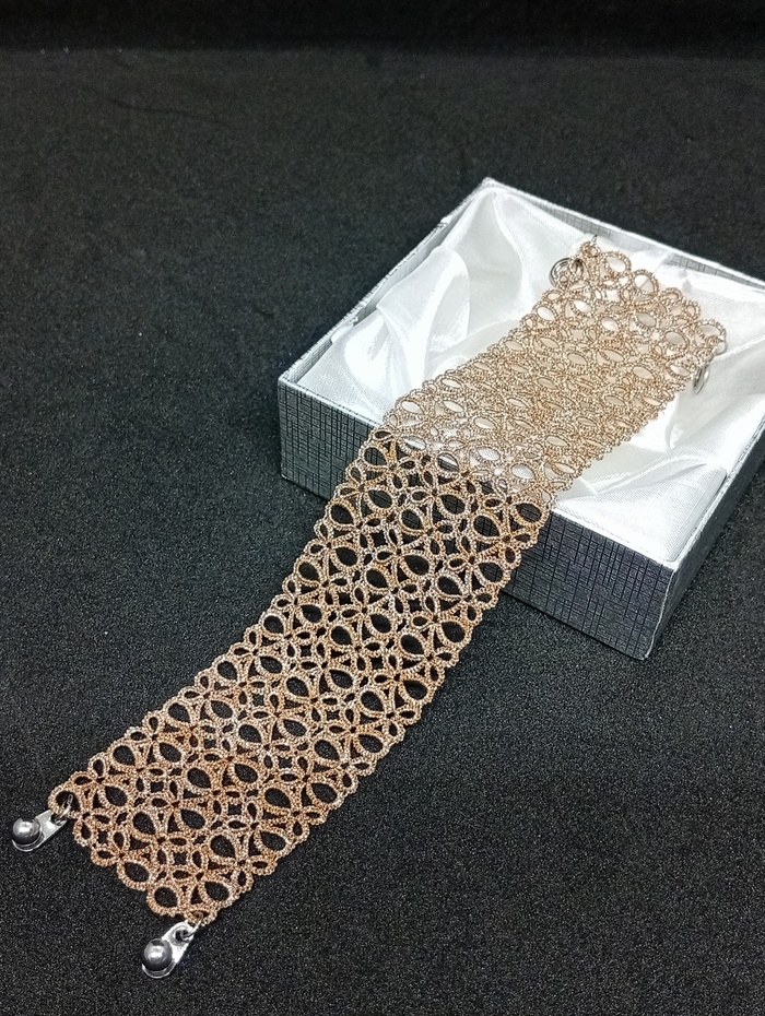 Украшения фриволите из металлизированных ниток. Это кружево, состоящее из множества узелков. За счет жесткости и прочности нити, а также самой техники украшения отлично держат форму. Я люблю тонкие нити, добавляю совсем немного бусин (или без них), и получаются украшения, похожие на ювелирные. Только намного легче и приятнее к коже.